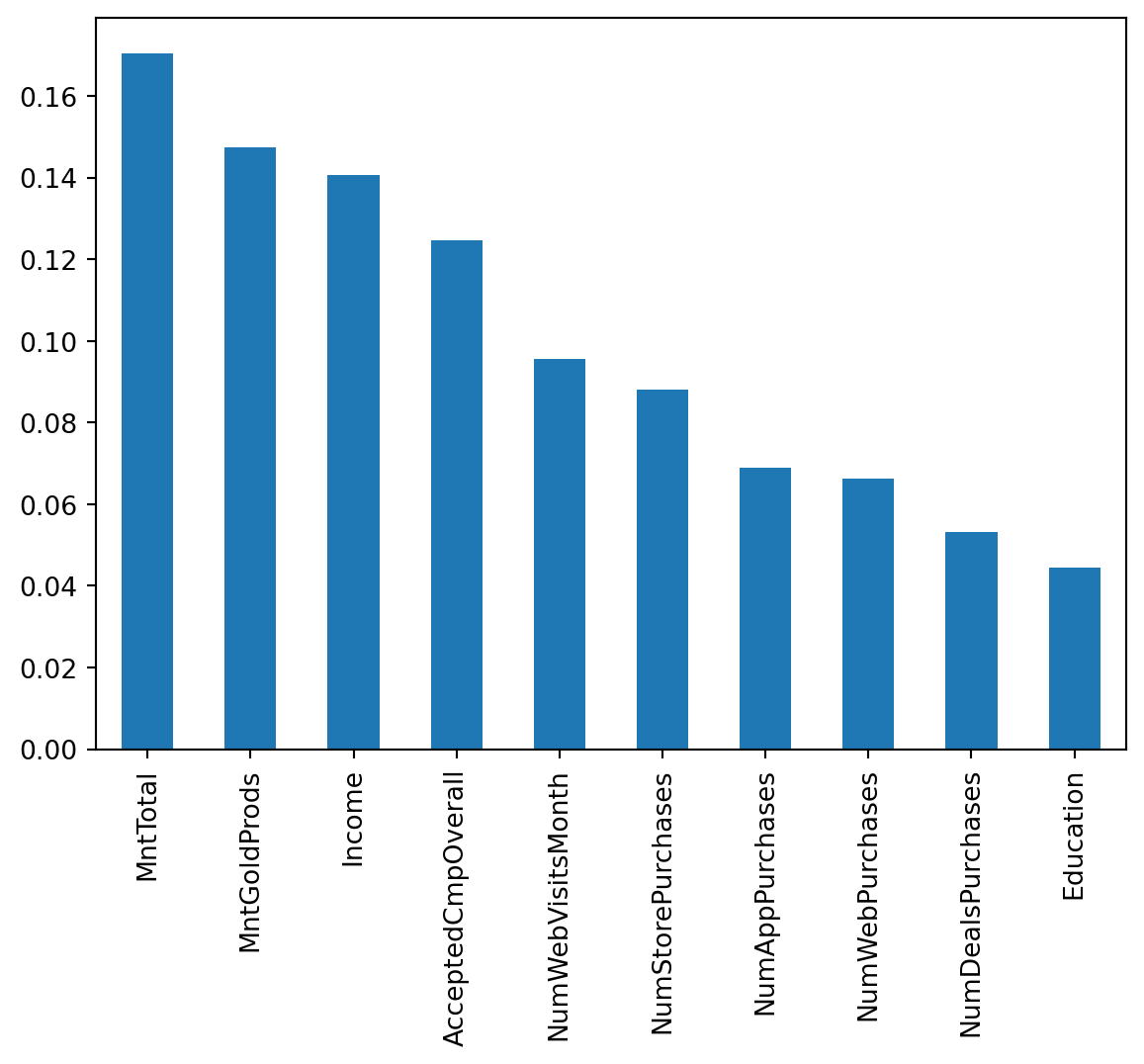 The chosen model has provided helpful information regarding customer responsiveness. This graph shows customer attributes. They are ranked with the attributes that most often lead to a response at the beginning, and the attributes that are least likely to lead to a response at the end. This suggests that finances, such as income and money spent, usually indicate a responder.