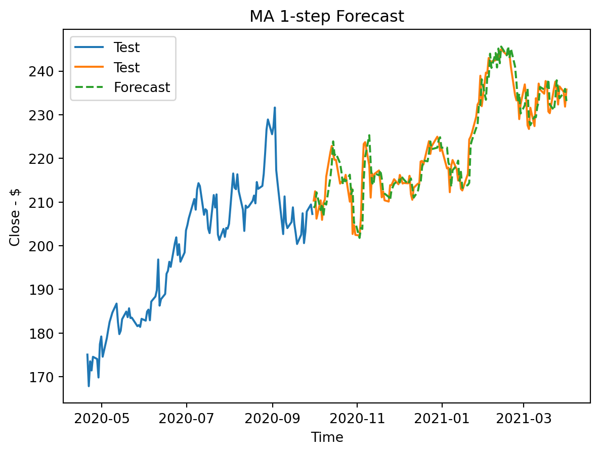 plt.title(f'MA 1-step Forecast')