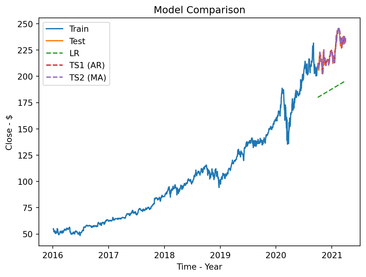 Similar to TS1, this model is very different from LR because it uses information of past errors to predict, not just the long-term trend. It also uses a rolling forecast method.