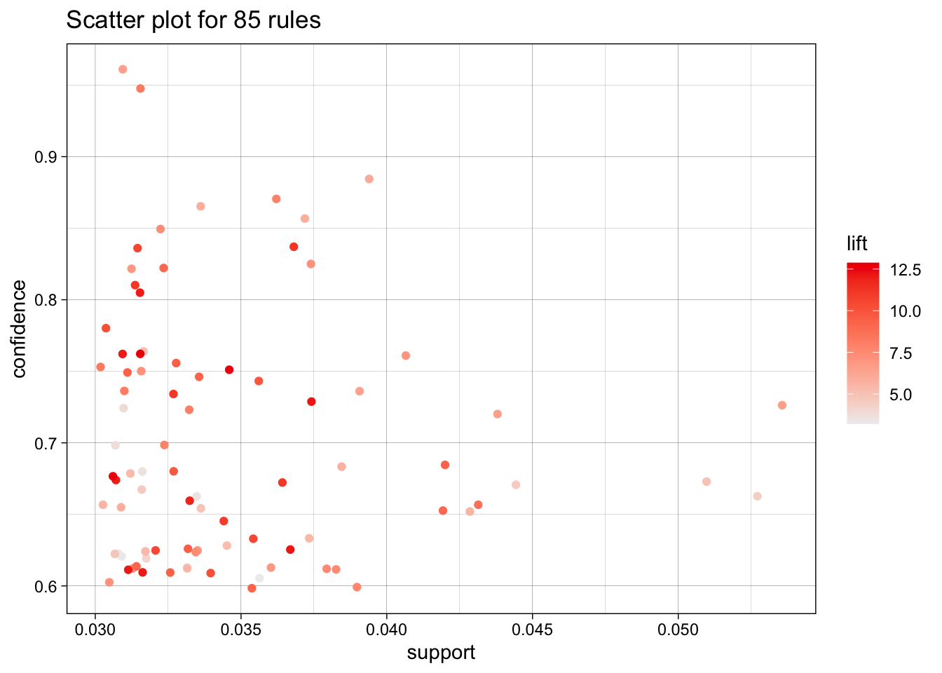 Unfortunately, after much effort, I was not able to get ruleInduction() for this set to succeed. It caused my environment to abort each time, no matter how small the set was or how much I reduced the transactions. This was odd because the transaction size was very comparable to the ‘tracks’ size. To the best of my knowledge, I believe this is an example of memory usage overload and complexity explosion. This was not entirely unexpected with choosing ECLAT over FP-Growth. Regardless, I have still determined the support to be 0.035 to allow for 47 itemsets.