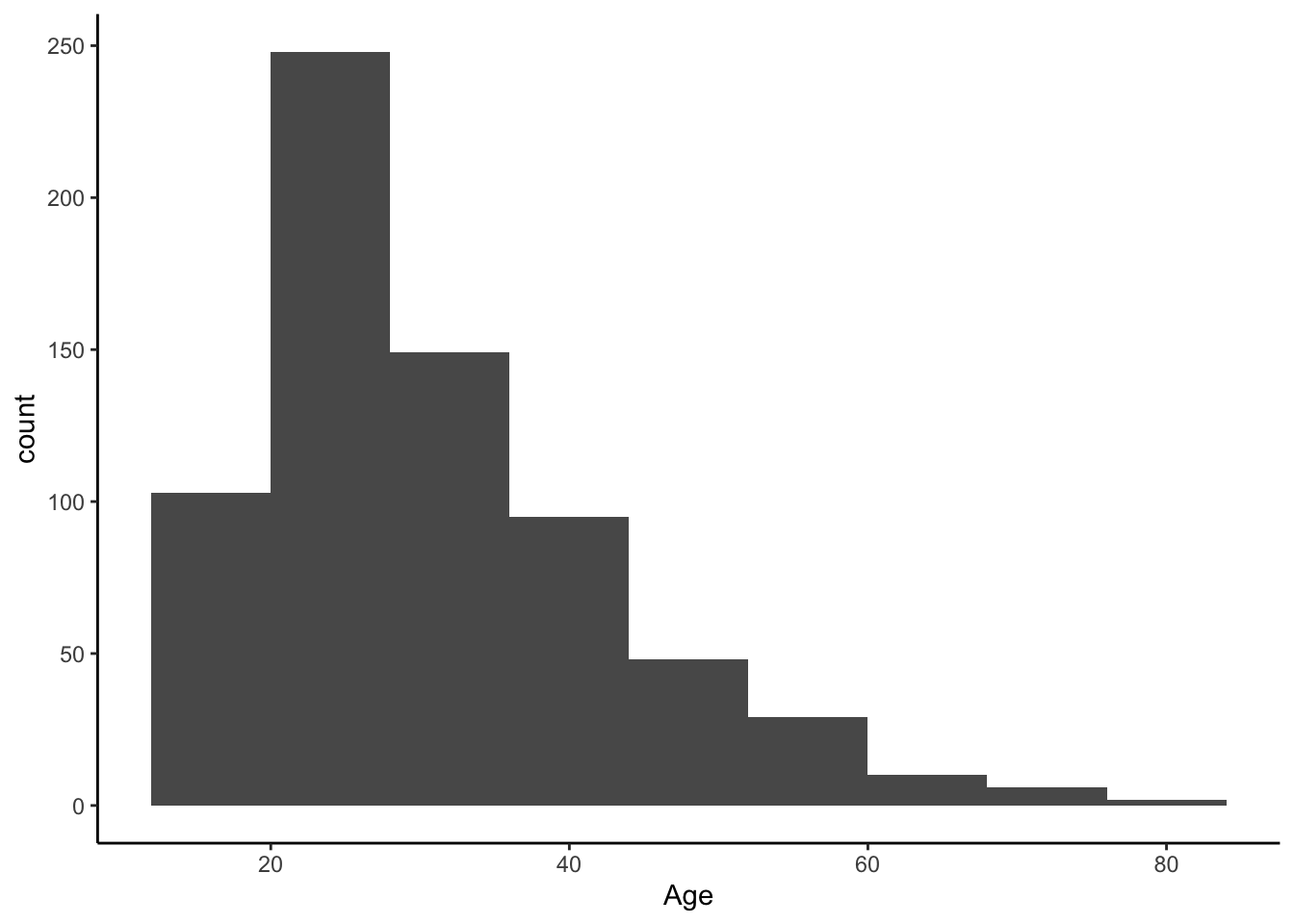 The argument binwidth has a large potential to impact the final visual. Simply adjusting the binwidth by one or two can overinflate or underinflate the visual representation of a certain subgroup. So it is important to keep the binwidth high. However, in this example, people tend to be familiar with grouping by tens (“twenties” and “thirties”), so just under 10 is the most appropriate.