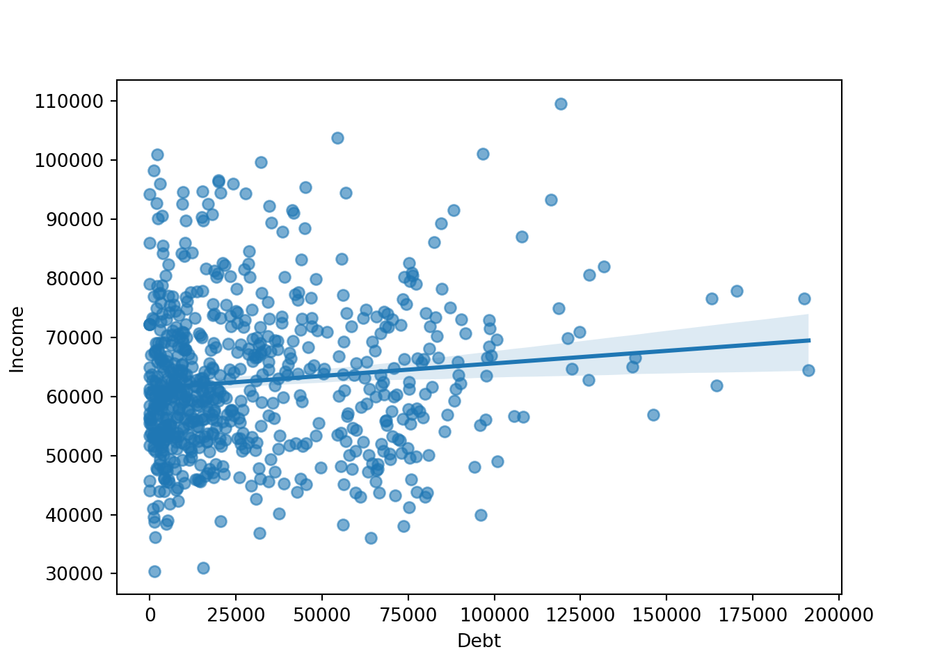 sns.regplot(x="Debt", y="Income", data=approval_data, scatter_kws={"alpha":0.6})