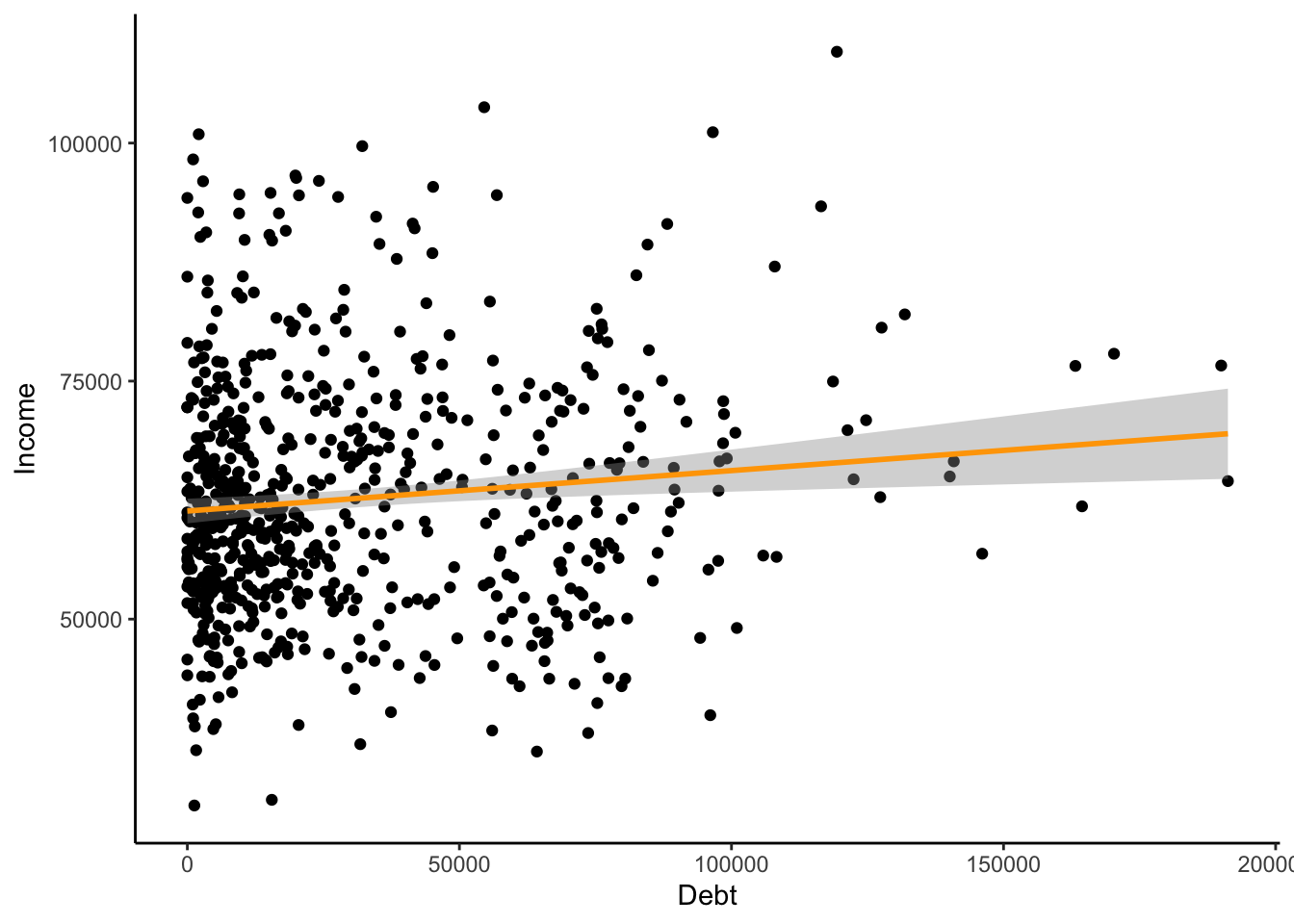 Create a scatterplot, debt (x-axis) and income (y-axis), trend line