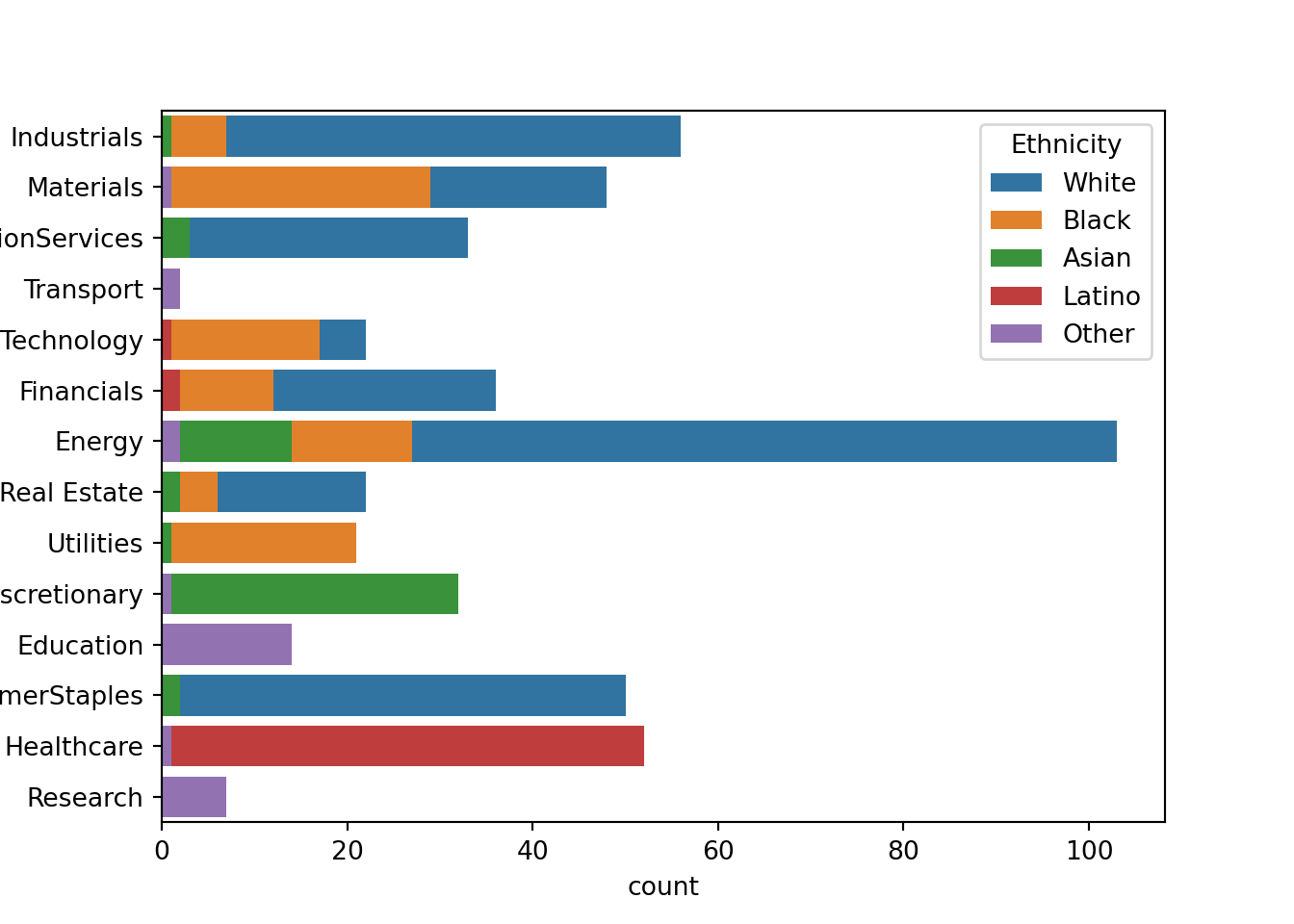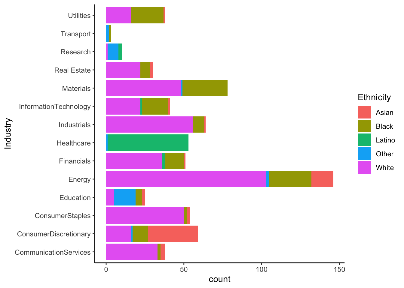 When viewing these plots, there are a few industries that are notable to me. Research, transport, and education are majority proportions of unlisted ethnicity. This could point to a structural bias in the data, seeing that certain ethnicities should have been included in the survey. Healthcare is another industry that could likely be suffering from sampling bias.