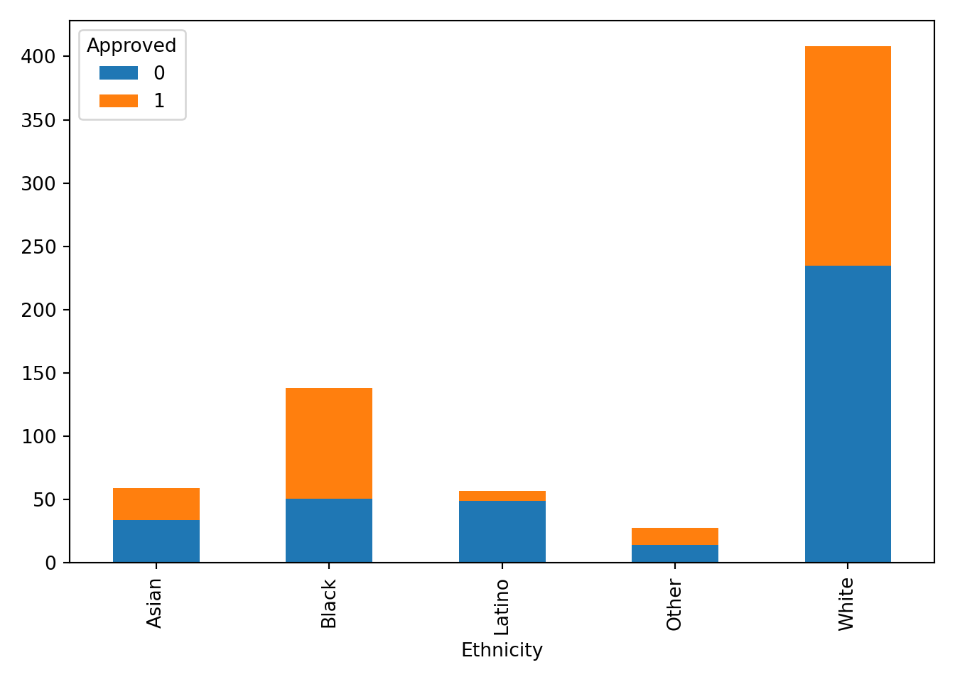 Stacked bar plot, number of approvals/disapprovals (y-axis) by ethnicity (x-axis)