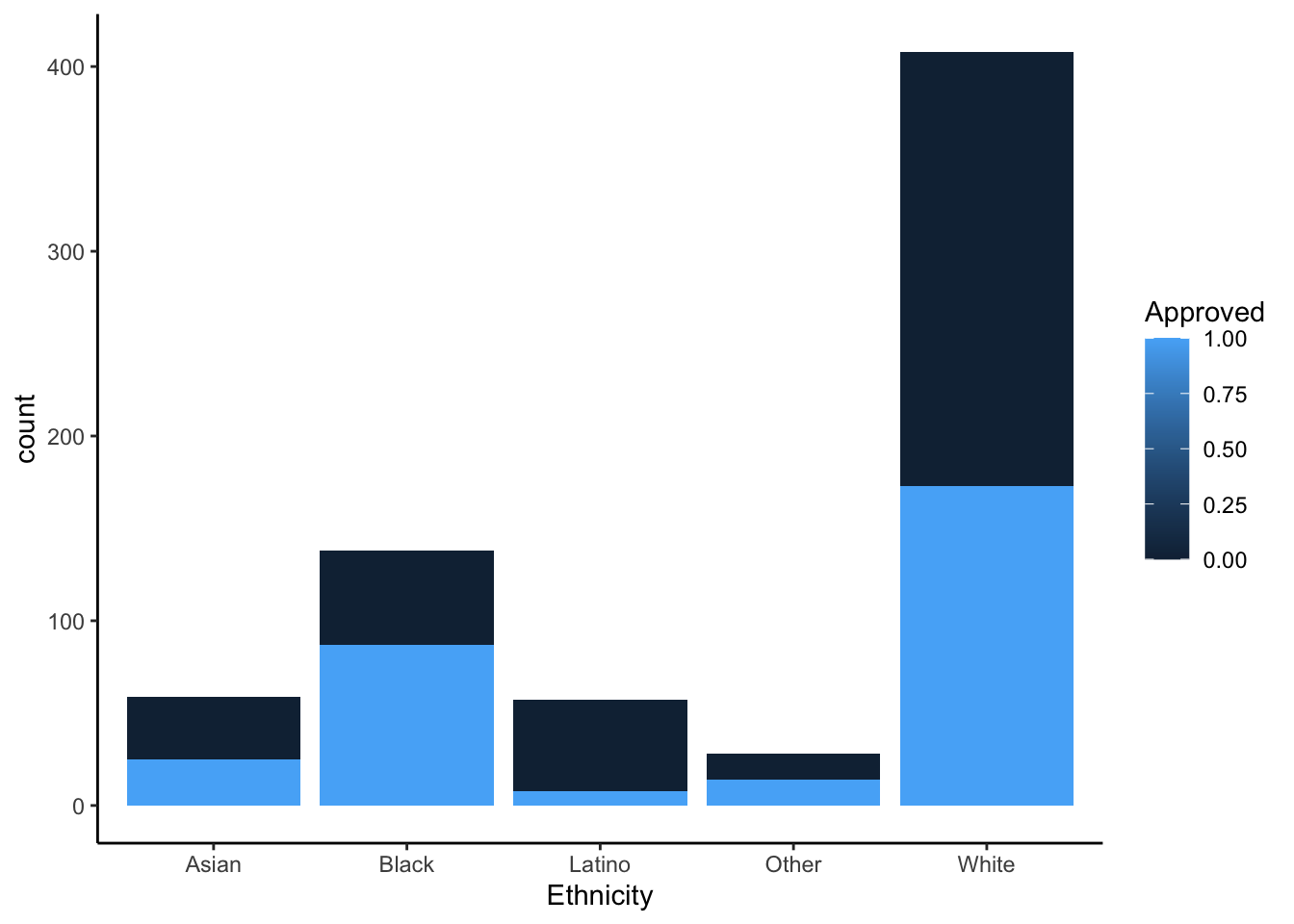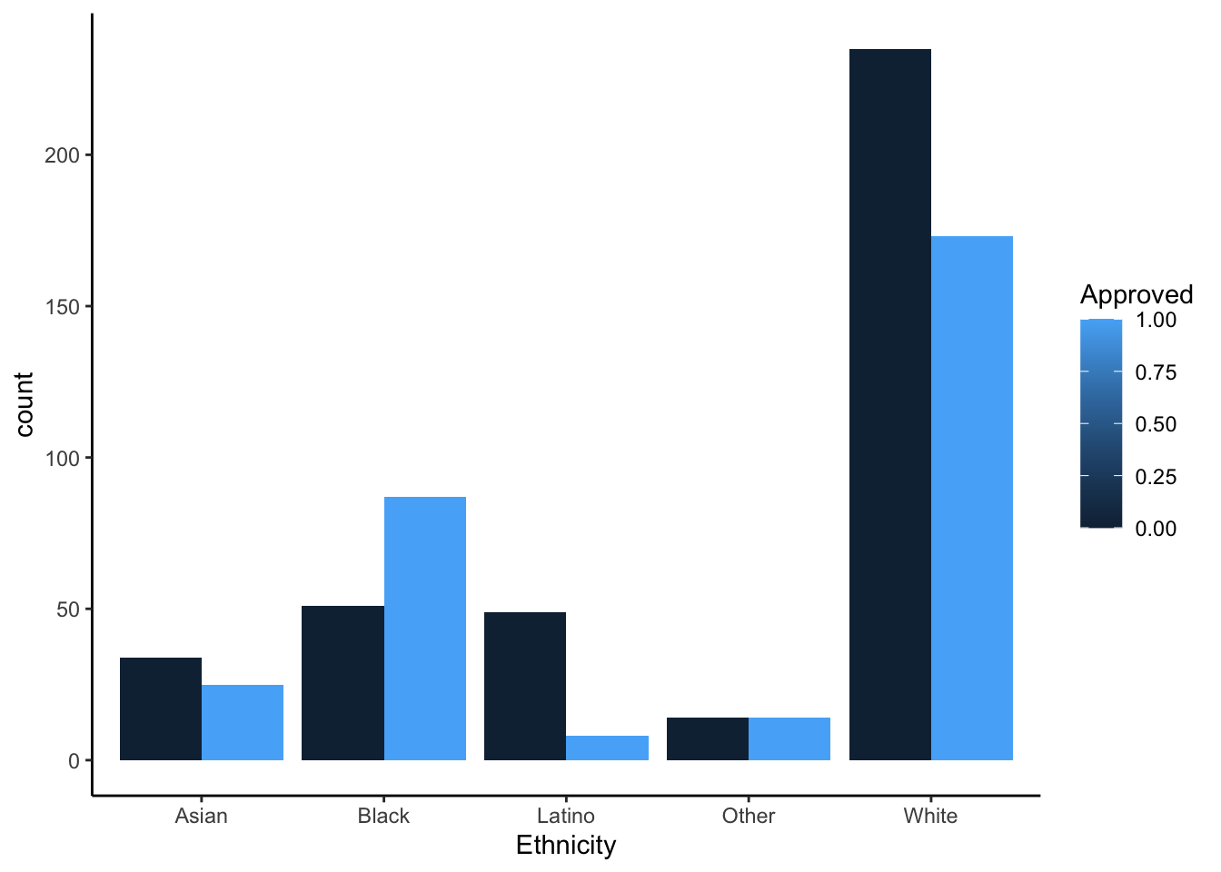 ggplot(approval_data, aes(x=Ethnicity, fill = Approved, group = Approved)) +