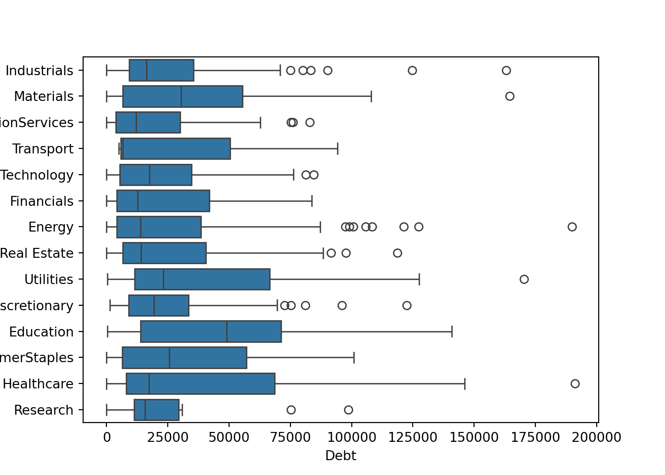 Box plot of debt (y-axis) against industry (x-axis) and save the graph